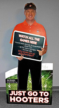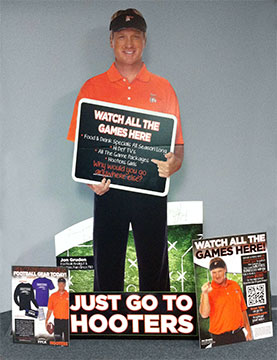 Various sized four color Point of Sale for Hooters and stand up with a die cut.